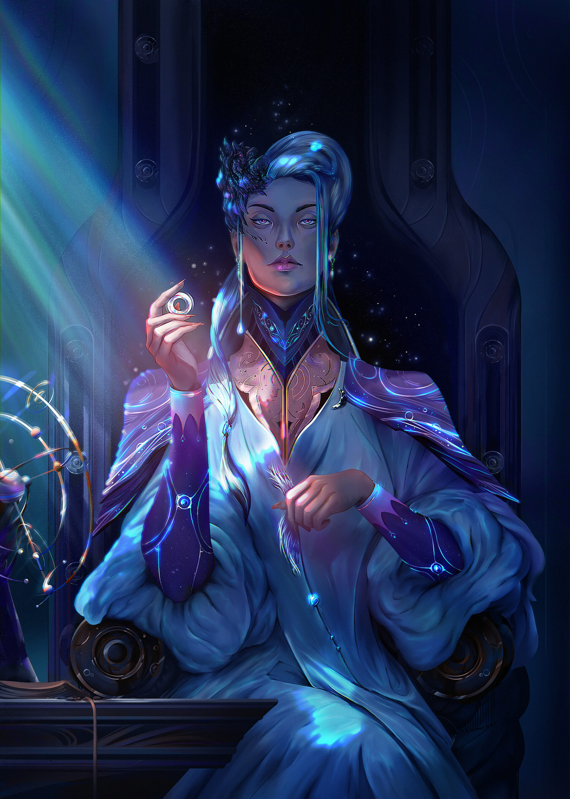 Dans cette carte alternative, Ailène est représentée dans toute sa complexité : fière, hantée, résiliente. Elle tient dans sa main un anneau de pouvoir arraché de la coiffe de Solis, la Malkah d’Arkhante. Un symbole aussi sacré que chargé de sens, héritage lumineux mais douloureux, dont l’éclat souligne autant sa légitimité que sa culpabilité. Cheffe du clan Solonite et sœur du dernier dynaste Hadrien, Ailène a vu ses ambitions personnelles se transformer en tragédie politique. Son échec à sceller une alliance avec Tornhil et sa quête de reconnaissance ont ouvert une brèche exploitée par les ennemis de Solon, menant à la chute de sa famille. Rescapée du massacre, elle s’exile avec Solonia, fille de son frère, et renaît dans le silence après le Blast pour porter haut les couleurs de son peuple. Dans l’ombre des étoiles, cette Ailène ne parle plus. Elle voit, avec une lucidité presque divine.
